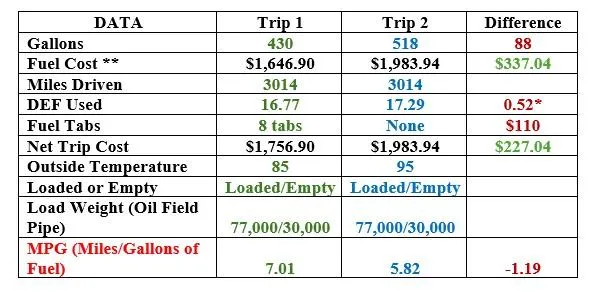 Additionally, the increase in Diesel Exhaust Fluid (DEF) usage during Trip 2, though relatively small at 0.52 gallons, suggests the engine was working harder and less efficiently without the fuel enhancement.